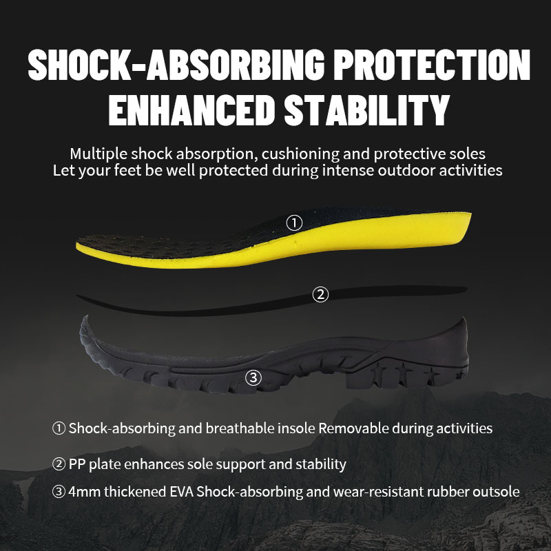 ①Oblazinjen, zračen vložek – odstranljiv, ko ga morate očistiti ali zamenjati. ②Ojačana s PP ploščo za dodatno oporo pod nogami, tako da je vsak korak trden in nadzorovan. ③4 mm odebeljen gumijast podplat EVA, ki blaži udarce in je odporen na obrabo.