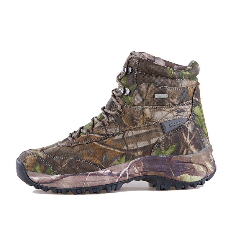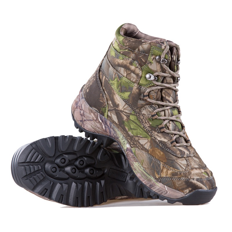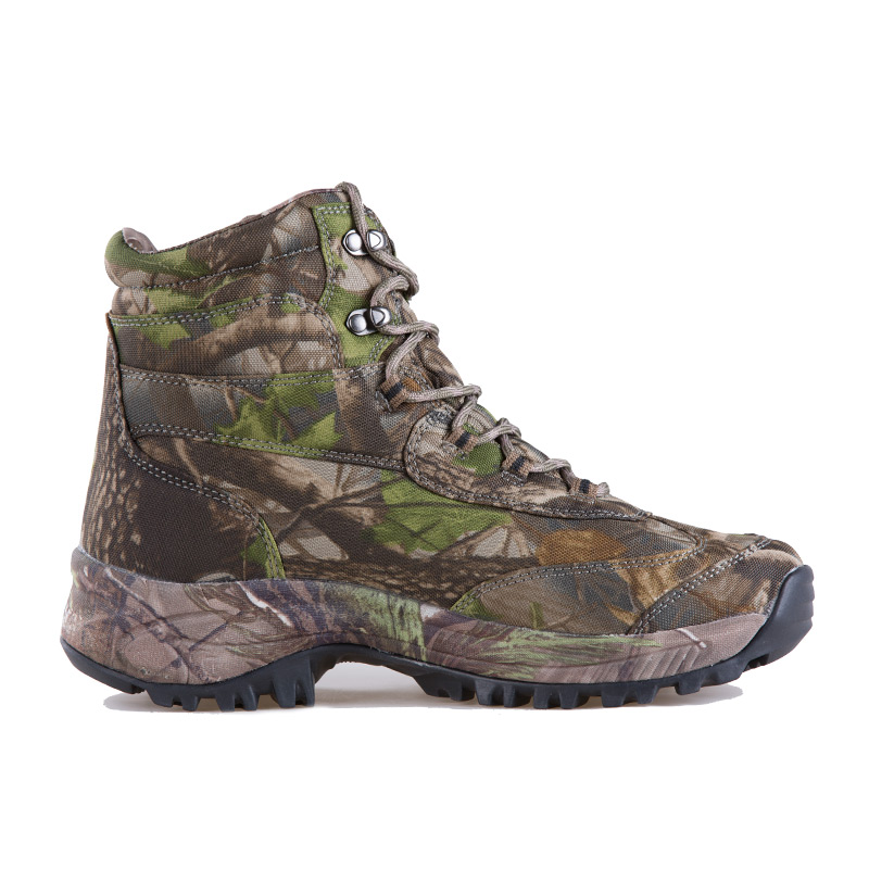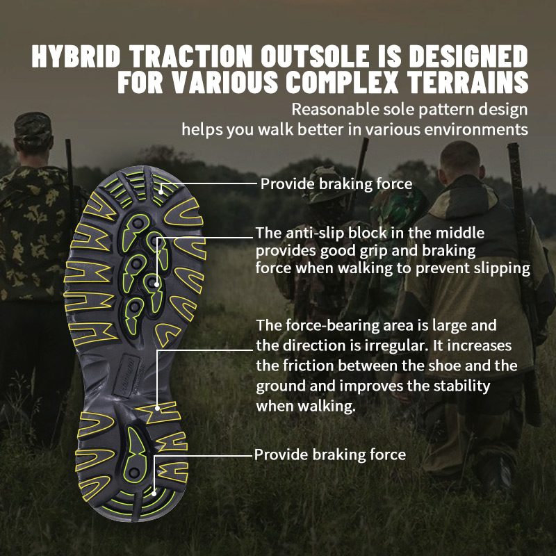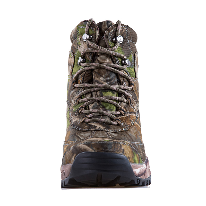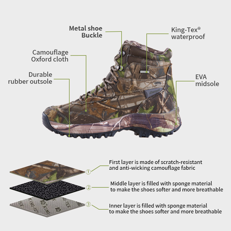 ①Poliyou visoko raztegljiv vložek, ki odvaja vlago, ohranja notranjost suho. ②EVA vmesni podplat, ovit v kamuflažno tkanino, blaženje in blaženje udarcev. ③Odporen gumijast podplat, nedrseč in odporen proti obrabi.