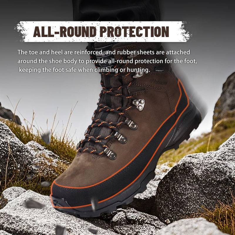 Prsti in peta so ojačani, gumijaste plošče pa so pritrjene okoli telesa čevlja, da zagotovijo vsestransko zaščito stopala in ohranjajo stopalo varno med plezanjem ali lovom.