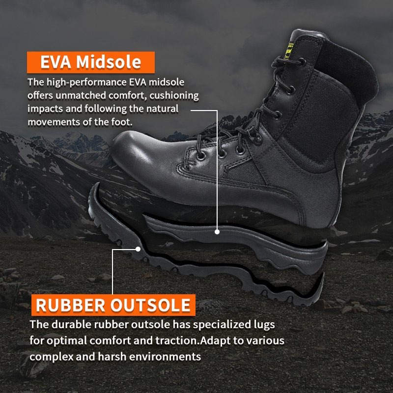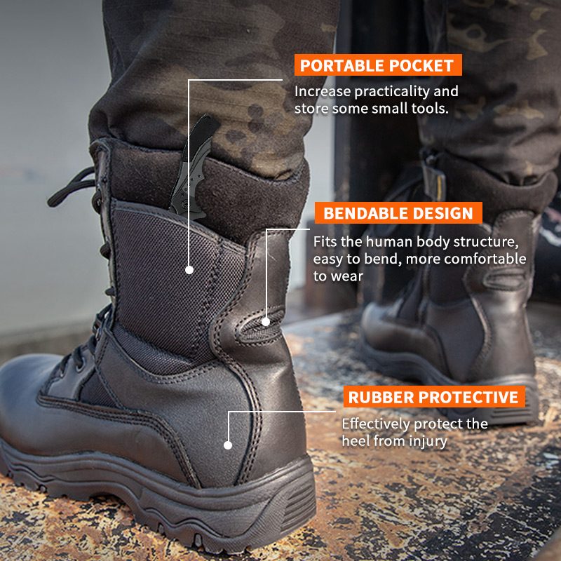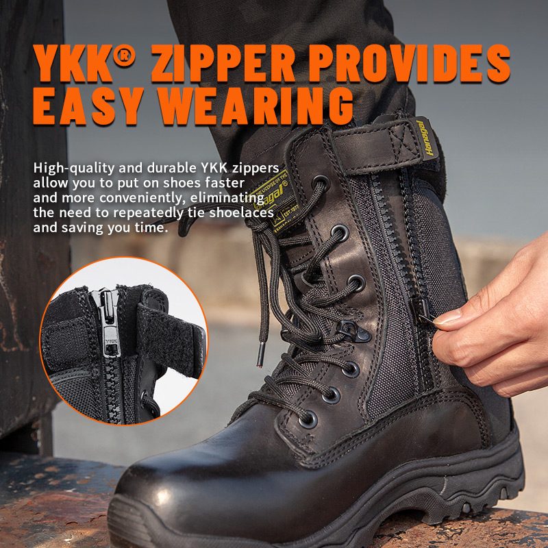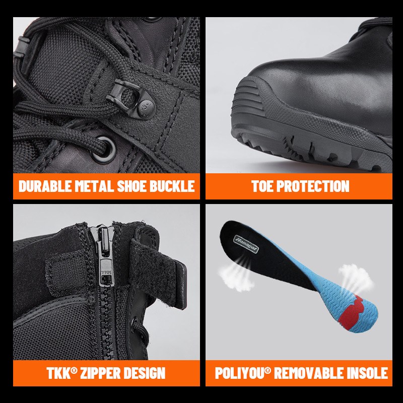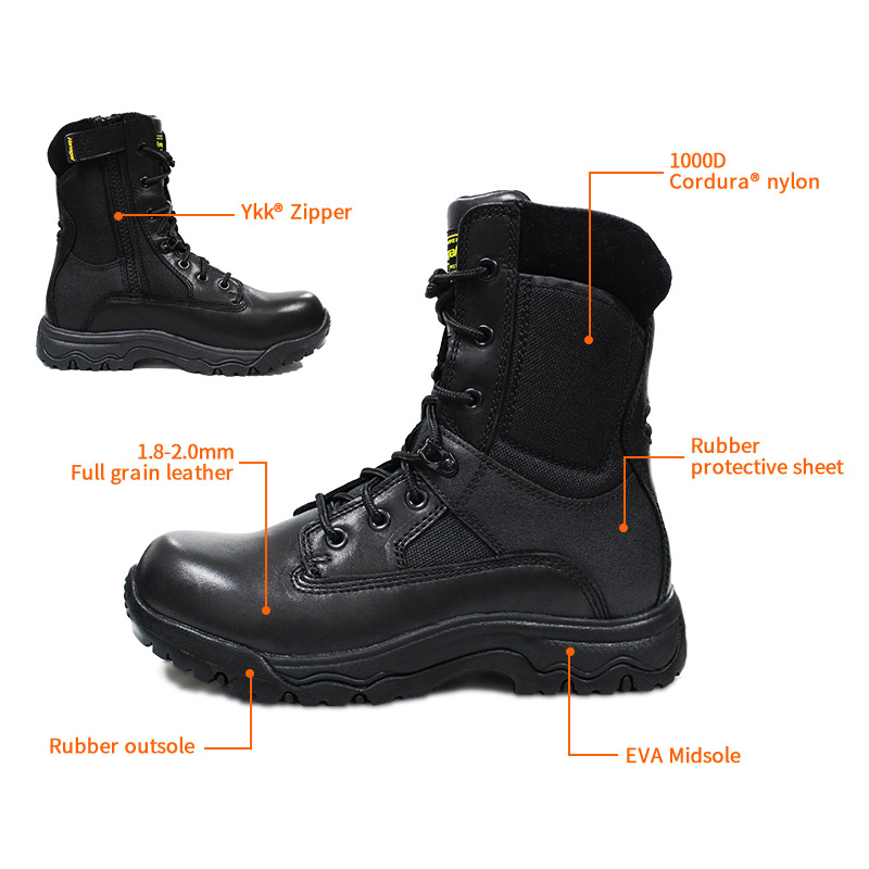 Ti policijski škornji YKK z zadrgo iz polnozrnatega usnja so na voljo za prilagajanje barv, materialov in podrobnosti, z MOQ 800 parov, idealni za sodelovanje z blagovno znamko in skupinsko nabavo. In ti lovski škornji imajo naslednje prednosti: